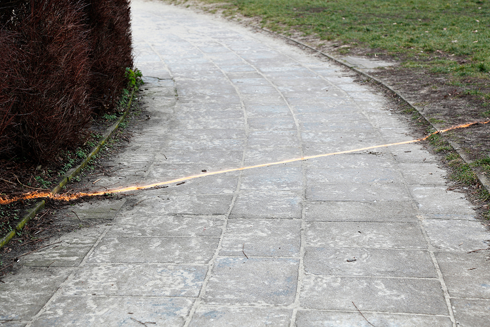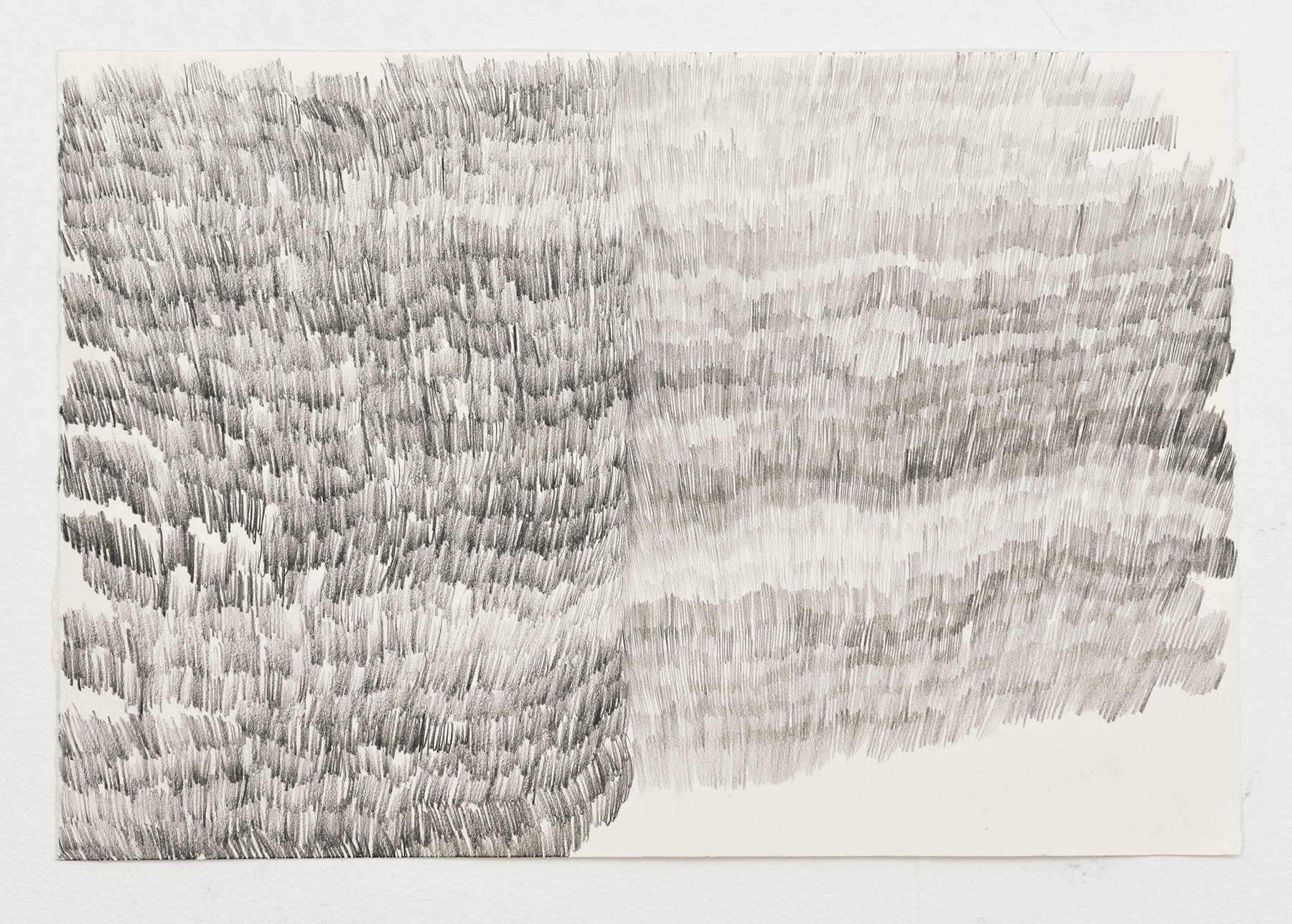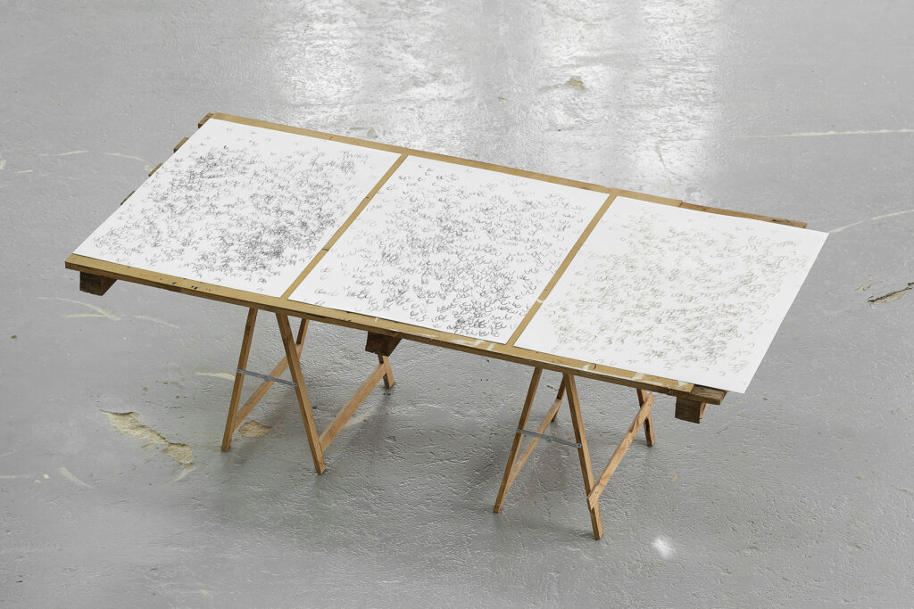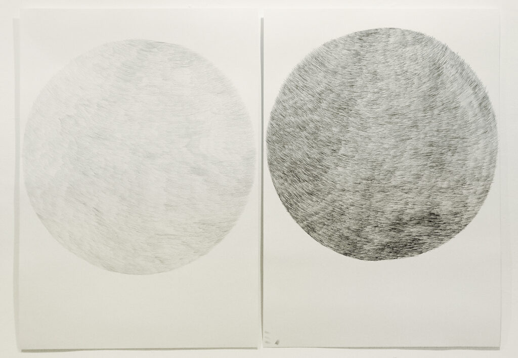 The artist throws a handful of hazelnuts onto a sheet of paper and traces the shapes cast by their shadows with a crayon, which slowly rotate on the surface as the hours pass. The action is repeated until a dense web of marks densifies on the sheet, declaring the drawing finished.